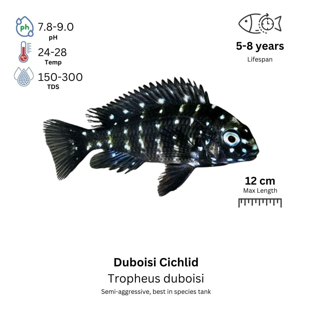 • Common Names: Duboisi Cichlid, White Spotted Cichlid