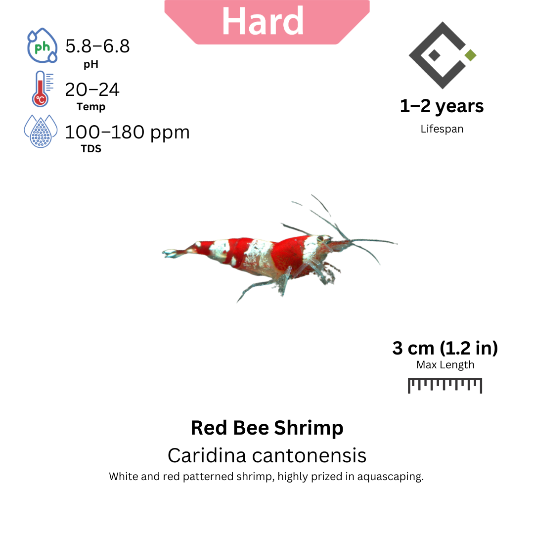 The Red Bee Shrimp was originally developed through selective breeding in Japan and Taiwan. It is a refined version of the Crystal Red Shrimp (CRS), with a focus on intense red coloration and high-quality white patterns. Today, it is bred globally by shrimp enthusiasts and commercial farms.